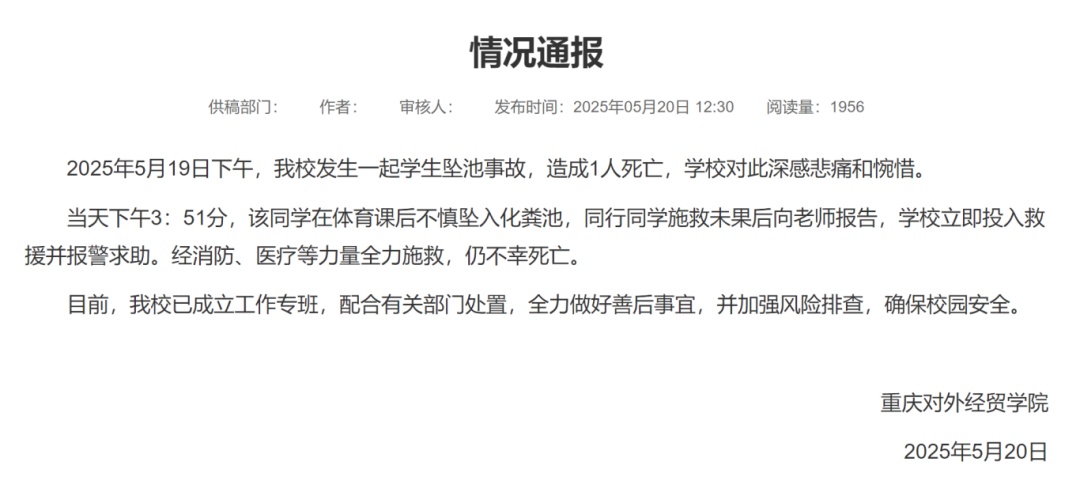 19日下午,我校产生一同学生坠池事端,形成1人逝世,学校对此深感沉痛和怅惘。