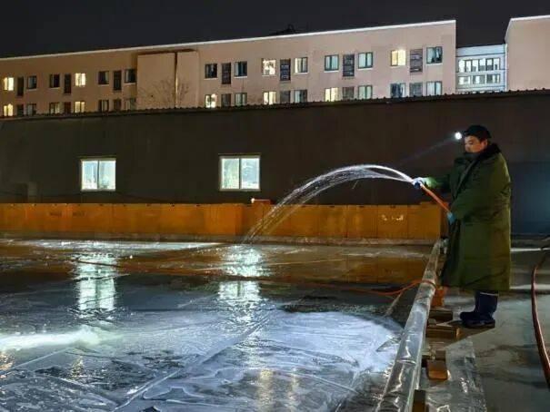 跟着冰场面积添加,造冰困难程度也相应进步。工作人员要在平坦好的土地上,先用防水布铺底,再用挡水石搭起围挡,保证洒水时不会渗漏。因为白日气温较高,校园晚上还需组织多名工作人员轮番进行洒水造冰。